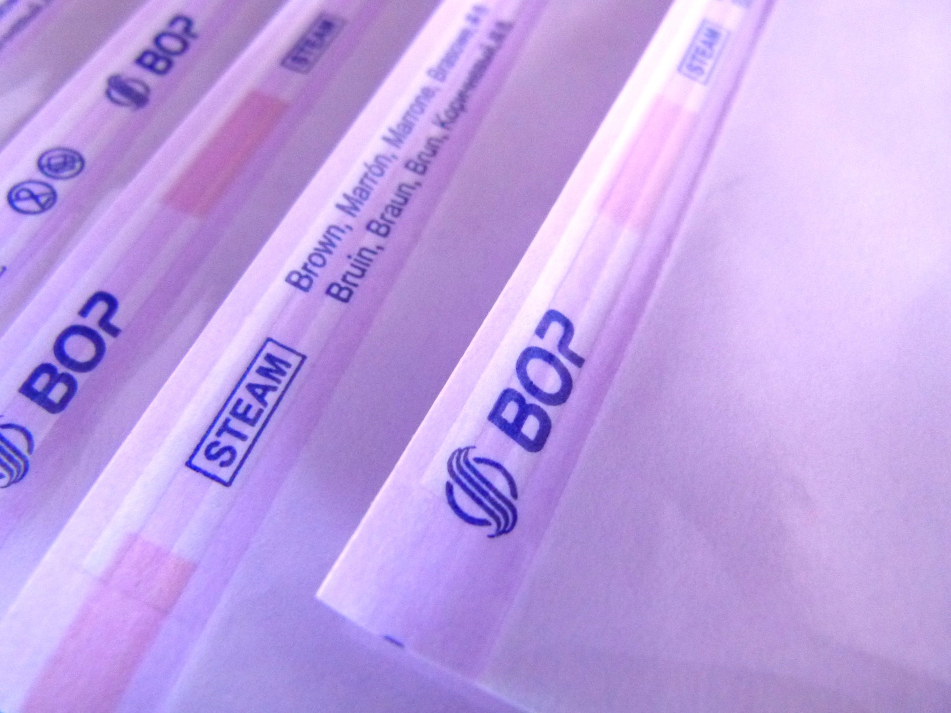 Fra lyserød til brun ved dampsterilisering, fra lyseblå til grøn ved (EO) gassterilisering og fra lilla til grøn ved formaldehydsterilisering. Indikatorerne er trykt på kanten af produkterne for at undgå afsmitning.