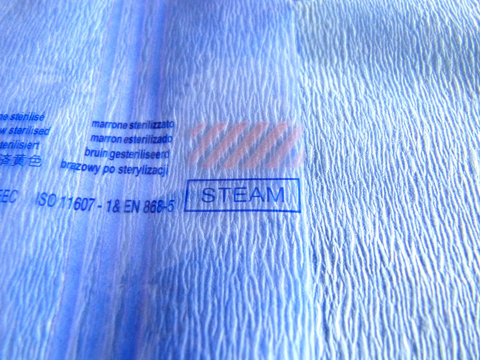 Fra lyserød til brun ved dampsterilisering, fra lyseblå til grøn ved (EO) gassterilisering. Indikatorerne er trykt på kanten af produkterne for at undgå afsmitning.
