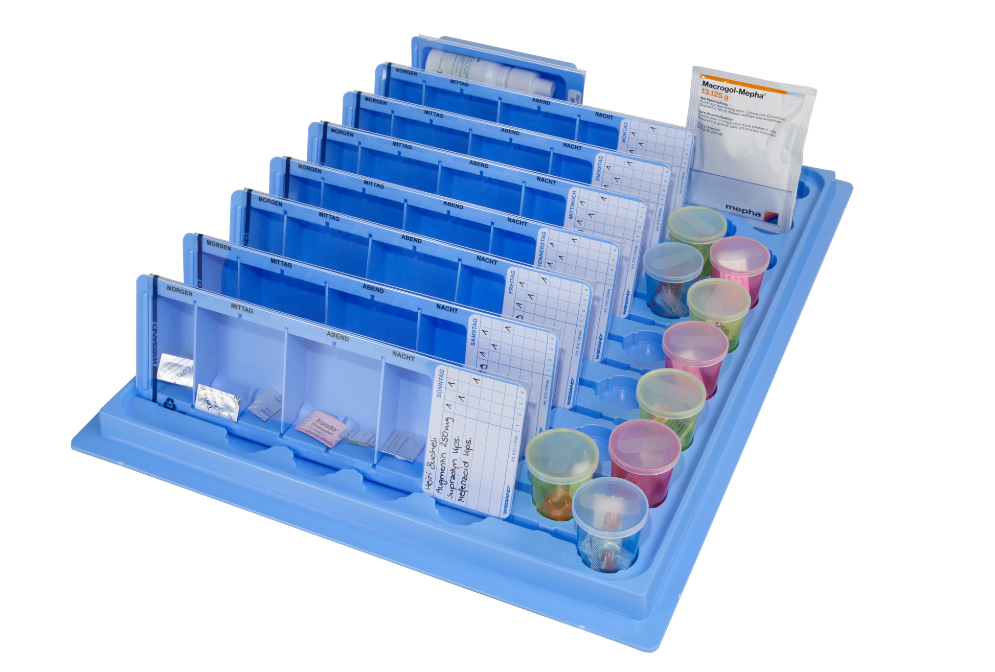 Denne store distribution-bakke har 17 riller og 54 positioner til distribution af mindre og mellemstore medicindispensere og medicinkopper. Rillerne og fordybningerne holder kopperne og dispenserne stabile på bakken. Patient- og medicindata kan integreres ved hjælp af etiketholdere og etiketter.