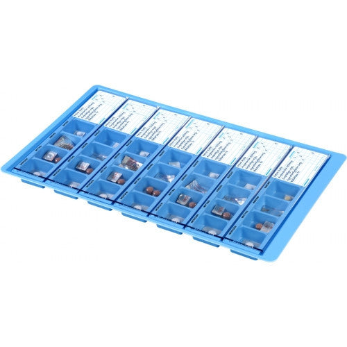 Beskrivelse: Denne uge bakke tilbyder plads til 7 små MediDispenser 11/19 og kan suppleres med et skydelåg. På denne bakke kan sygeplejestationen eller apoteket forberede patientens medicin til en uge. Den er velegnet til langtidsbehandling på plejehjem og klinikker.